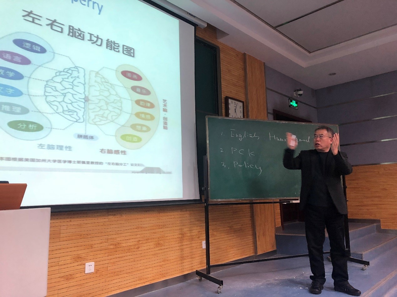 讲座主题是英语思维与口语的培养。首先张老师向同学们提出一个问题:你为什么学习英语?现场同学积极响应,张老师以此开始今天的讲座。他分享了当年在师大的学习时光以及他这39年来深入基础外语教育的经历。结合自己丰富的教学经验,他送给同学们三个词:English——精通英语;PCK——精通学科教学知识;Policy——关注并研究国家和地方的教学标准。
