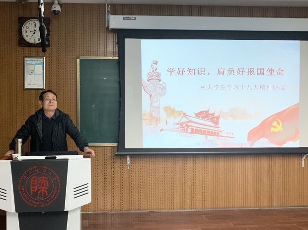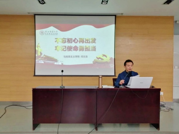 马克思主义学院党委书记闫文浩进行了“不忘初心再出发,牢记使命勇担当”的主题党课。他不仅提出了“初心”的内涵和概念,还论述了本次教育活动的理论逻辑与实践逻辑。他反复强调了“不忘初心、牢记使命”是我们党的力量源泉,并希望在座的各位同学能够成为历史的坚定者、奋进者和搏击者,而不是时代的犹豫者、懈怠者和畏难者。