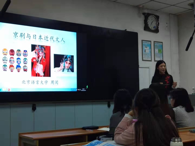 周阅教授首先从日本近代作家芥川龙之介的访中游记为开篇,以京剧这一传统中国艺术美为着眼点,展开了京剧与日本近代文人的探讨。随后又以辻听花等日本京剧爱好者对京剧的评价,以及谷琦润一郎等日本文学家的作品中出现的京剧元素展开,向大家介绍了比较文学中周教授所发现的新角度。周阅教授治学风格严谨,老师同学们进行了积极的互动交流。在提问环节中,英语系和文学院的老师以及日语系的几位同学与周教授展开了热烈的讨论。周阅教授最后强调,做学术因注重融会贯通,所在一字谓之博。