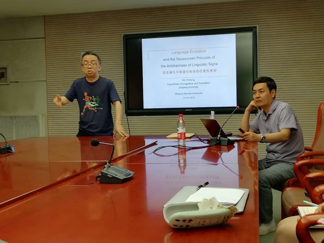 2019年6月13日下午4点,应必赢76net线路官网和必赢76net线路官网语言与认知研究所所长张韧教授的邀请,浙江大学“求是”特聘教授,爱丁堡大学语言学博士,国家社科基金重大项目首席专家吴义诚教授莅临雁塔校区崇鋈楼敏行厅开展题为“语言演化与语言符号的刻意性”的学术讲座。该讲座为必赢76net线路官网著名学者系列讲座第一百零三讲。讲座由张韧教授主持,参加人员包括外国学院部分教师、硕博士研究生、校内其他学院的师生代表。