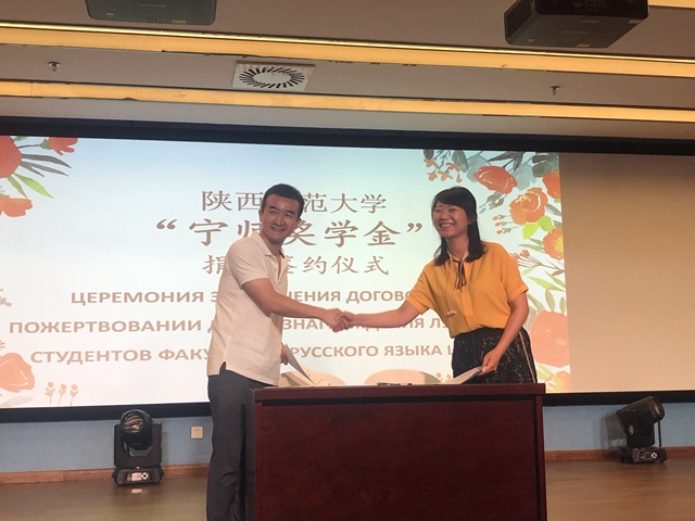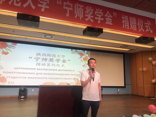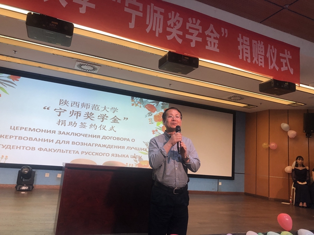 随后,“宁师奖学金”捐助签约仪式正式开始。“宁师奖学金”由学院1972级俄语系首届校友王国宏和其子西安中欧创新技术有限公司总经理宁晶设立,捐助金额共9万元,旨在促进我校俄语人才的培养和俄语系发展。王翠代表俄语系师生向奖学金捐赠人表达了诚挚的敬意和衷心的感谢。宁晶与必赢76net线路官网教育基金会代表杨高玕现场进行捐赠协议书签约。王国宏老师在发言中回顾了自己与俄语的不解之缘,勉励俄语系学生要珍惜在校时光、打好专业基础,奋发图强,为中俄两国文化的传播贡献自己的力量。宁晶在发言中谈到母亲与师大俄语系的紧密联系,并祝愿师大越办越好。马正平代表学院感谢俄语系校友的无私捐助,他强调这是校友在学院层面设立的第一个奖学金,对学生来说是一笔珍贵的资助,对教师来说是无声的鼓励,一定会用好这笔奖学金,争取培养更多优秀的俄语人才。