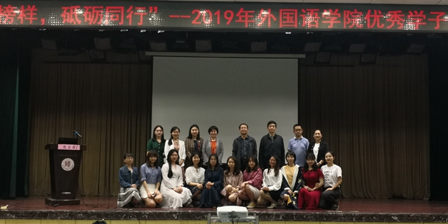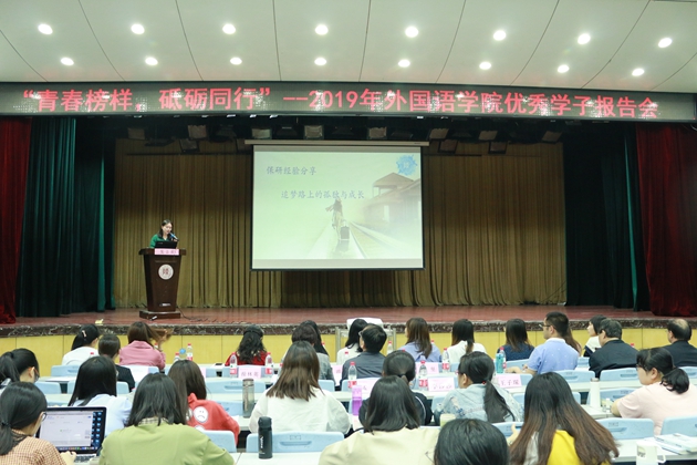 2019年5月19日晚,我院“青春榜样,砥砺同行“2019年优秀学子报告会在雁塔校区积学堂隆重举行。来自必赢官网英语系、翻译系、日语系、俄语系及研究生阶段的8名优秀学子分享了她们在大学中的奋斗历程和学习经验。必赢76net线路官网党委书记马正平、副院长鲁燕、前党委书记冯武鸣、英语系老师王立永、翻译系主任操林英、俄语系主任孟霞、日语系老师席卫国及部分辅导员参加了报告会并进行师长寄语。学院大一、大二、研一全体同学聆听了报告。报告会由2019级辅导员孟颖主持。