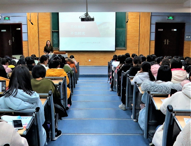 报告会伊始,鲁燕老师结合近期我校大型毕业生就业招聘会及学院所开展的毕业生就业工作,告诫同学们大学四年的时光转瞬即逝,要充分利用好每一分每一秒,并举例优秀毕业生为榜样,引导大家尽早树立人生目标,提早规划好未来道路并为之奋斗。