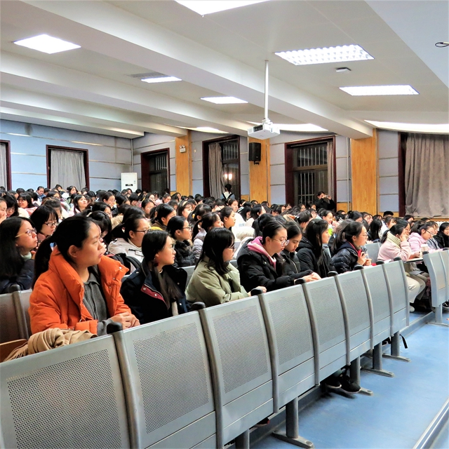随后,鲁燕老师从三面与大家分享了如何“不负美好大学时光”。一是作为外语学子,要拥有“家国情怀”的大格局。不仅将外语作为与外界沟通的桥梁,以国际化视野观世界变化,还要将外语与其他专业相结合并深入钻研,争做国家需要的国际化人才。“大学之道,在明明德。”鲁院长指出,“德”即为对国家对民族深沉的大情怀。通过观看复旦大学教师熊浩《家国天下》的演讲视频,从三个普通人向国家无私奉献的故事,使同学们深刻体会到“家国情怀”的内涵。二是要将个人目标与国家发展同向而行。鲁燕老师指出,当代大学生生逢其时,这是青年人大可作为的时代。建议大家要充分利用校内学习资源,主动多听报告会、多与老师交流、多了解专业学科发展的最新动态,脚踏实地,苦学实干,让个人理想与时代主题同心同向而行,激发最强劲的奋斗力量。三是要珍惜生活守望相助,学会调节心理状态。通过讲解几则学生工作案例,鲁燕老师指导同学们树立自助与互助意识。一方面可以通过主动向他人倾诉或参加学校“相约星期二,你说我来听”等活动,主动寻求帮助,释放心理压力;另一方面在同学之间要互相关心关爱,包容接纳,在他人需要帮助时伸出援助之手,共同渡过美好的大学生活。报告会最后,鲁燕副院长鼓励同学们珍惜当下,珍惜同窗友谊,珍惜大学里的优良资源与宝贵机会。祝愿大家在毕业时回望大学时光,能够不留遗憾。