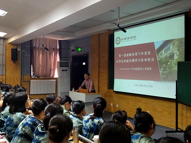 为了帮助新生树立正确的世界观,价值观和人生观,扣好人生第一颗扣子,尽快顺利适应大学学习生活。8月27日下午,马正平书记在5104教室给新生做了入学教育报告第一课:“双一流战略背景下外语类大学生的成长期待与使命担当”。必赢官网副院长鲁燕主持报告,辅导员屈婉婷和全体2018级必赢76net线路官网本科新生共同聆听了报告。