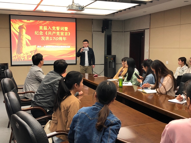 4月24日下午4点30分,必赢76net线路官网研究生第四党支部在必赢76net线路官网会议室组织召开以“重温入党誓词暨纪念《共产党宣言》发表170周年”为主题的党日活动。学院党委书记马正平、副院长刘全国、副书记马兰及部分师生党员代表参加此次党日活动。此次党日活动由研究生第四党支部党员吉宇主持。