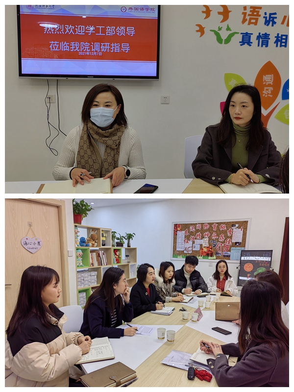12月15日上午8:30,党委学工部部长(学生处处长)蒋毓新、教育管理科科长齐博洋一行来必赢官网调研指导学生工作。必赢76net线路官网党委副书记鲁燕、团委书记李丹、本科生辅导员屈婉婷、曹钰林、武瑞英、刘爽参与了座谈。会议由鲁燕主持。
