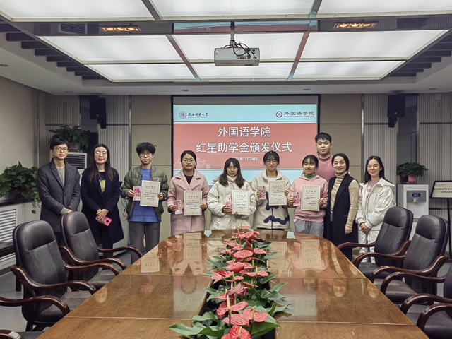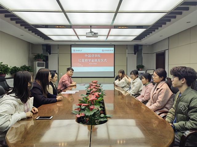 仪式开始后,曹钰林介绍了本届“红星助学金”的奖励标准及评选情况。李丹为受助学生讲解了“红星助学金”的设立背景,及设立人——必赢76net线路官网退休教师钟家珍及其爱人张悦光老师的故事与愿望。鲁燕表达了对受助学生的祝贺,勉励他们传承外语人的精神品质,在大学成长中能坚守初心自立自强,并在各项创新创业大赛中有所突破。
