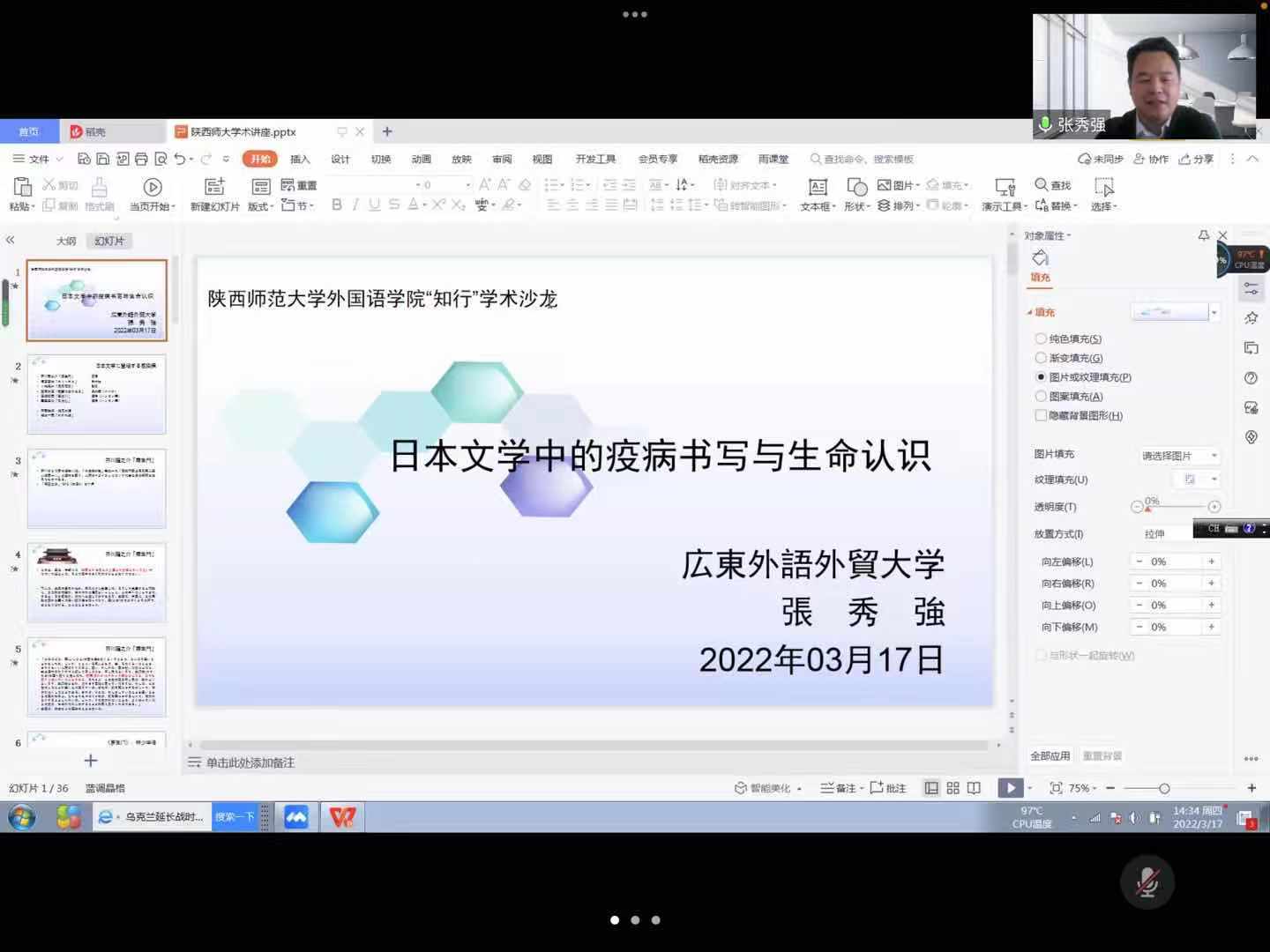 2022年3月17日下午,必赢76net线路官网“知行”系列学术沙龙“日本文学中的疫病书写与生命认识”在腾讯会议上举办。本次沙龙由东北亚与欧洲研究学科团队主办,广东外语外贸大学张秀强教授主讲,必赢官网曹婷副院长主持,必赢76net线路官网日语系及校外师生近40人参加。