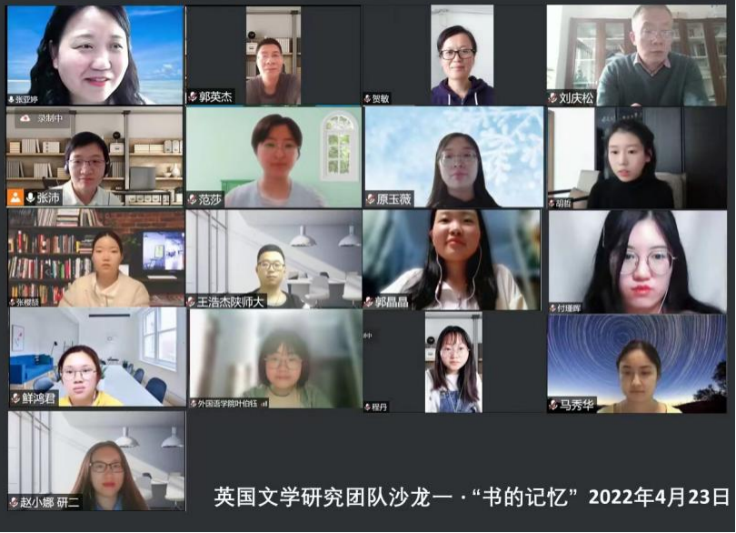 2022年4月23日下午,正值“世界读书日”之际,必赢76net线路官网英国文学研究团队举行主题为“书的记忆”线上沙龙。本场沙龙由“书的历史”、“书香年华”、“与书相逢”三个话题组成,旨在搭建更加开放包容的学术交流平台,让师生在浓郁的书香氛围中加深对书与记忆、人生的认识。必赢76net线路官网张亚婷教授、刘庆松副教授、郭英杰副教授、贺敏副教授、原玉薇博士、范莎博士、胡哲博士以及学院部分研究生参与此次沙龙,会议由张沛博士主持。