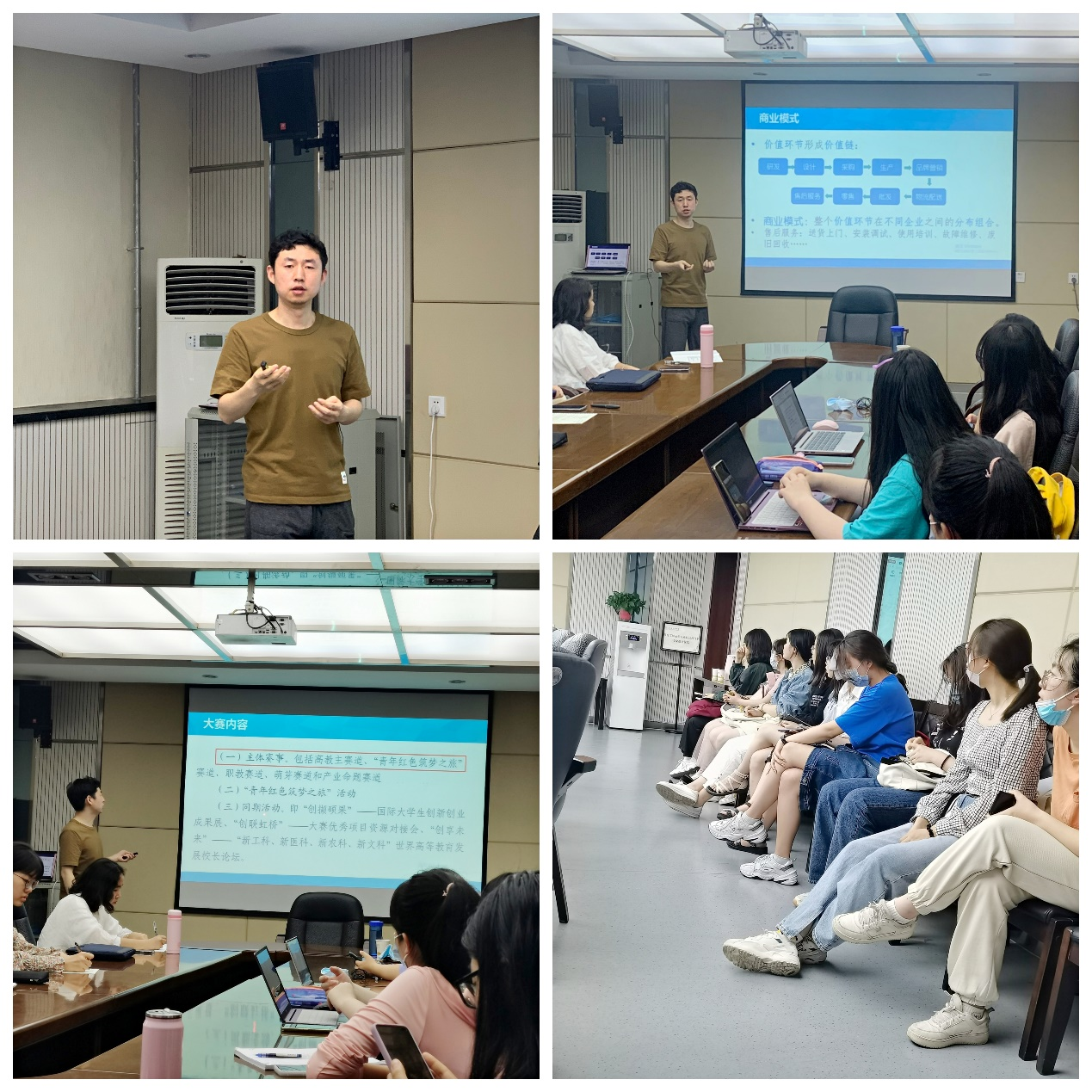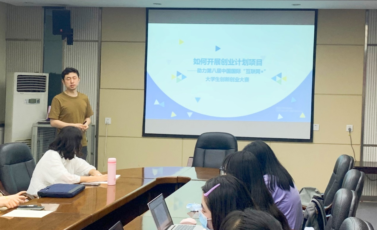 首先,郭玉晶老师从“互联网+”、大学生创新创业大赛等比赛项目背景出发,向大家阐明各赛事的不同特点,介绍开展项目设计的总体思路以及如何开展创业计划项目。接下来,细致讲解参赛要点,从项目定位、市场规模、产品介绍等关键环节,着重展示商业计划书的写作方法和路演汇报的呈现技巧。
