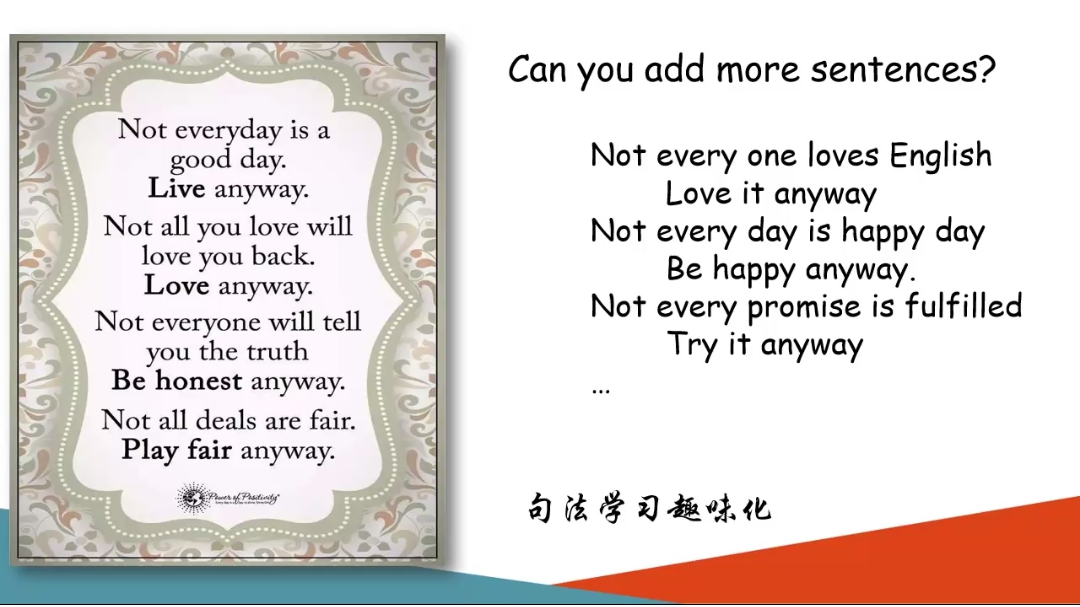 在同学们对课堂教学模式和课后练习部分有了充分了解之后,李革菊老师展示了英语教学中的一些经典实例,并与同学们一起展开具体分析,使同学们深刻了解了语法教学及句法学习的一些变化趋势及其特点,如语法教学的趣味化、生活化、系统化,并向我们展示了教师及学生对习题不同的改编,反映出了教学法在实际教学当中的不同应用及实际效果。