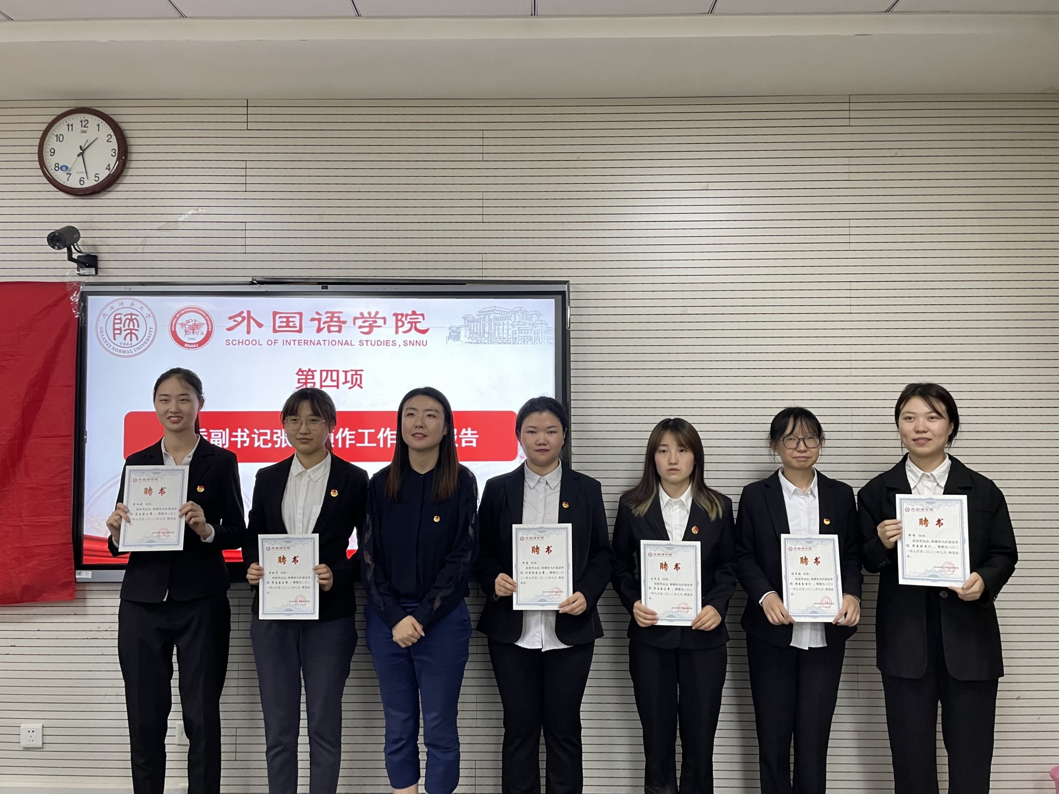 李丹为本届学生组织干部葛虹宇、李雨婷、刘岚岚、张月颖、郭倩、田圆发放了聘书,希望她们站在新起点上昂首阔步、奋勇向前。
