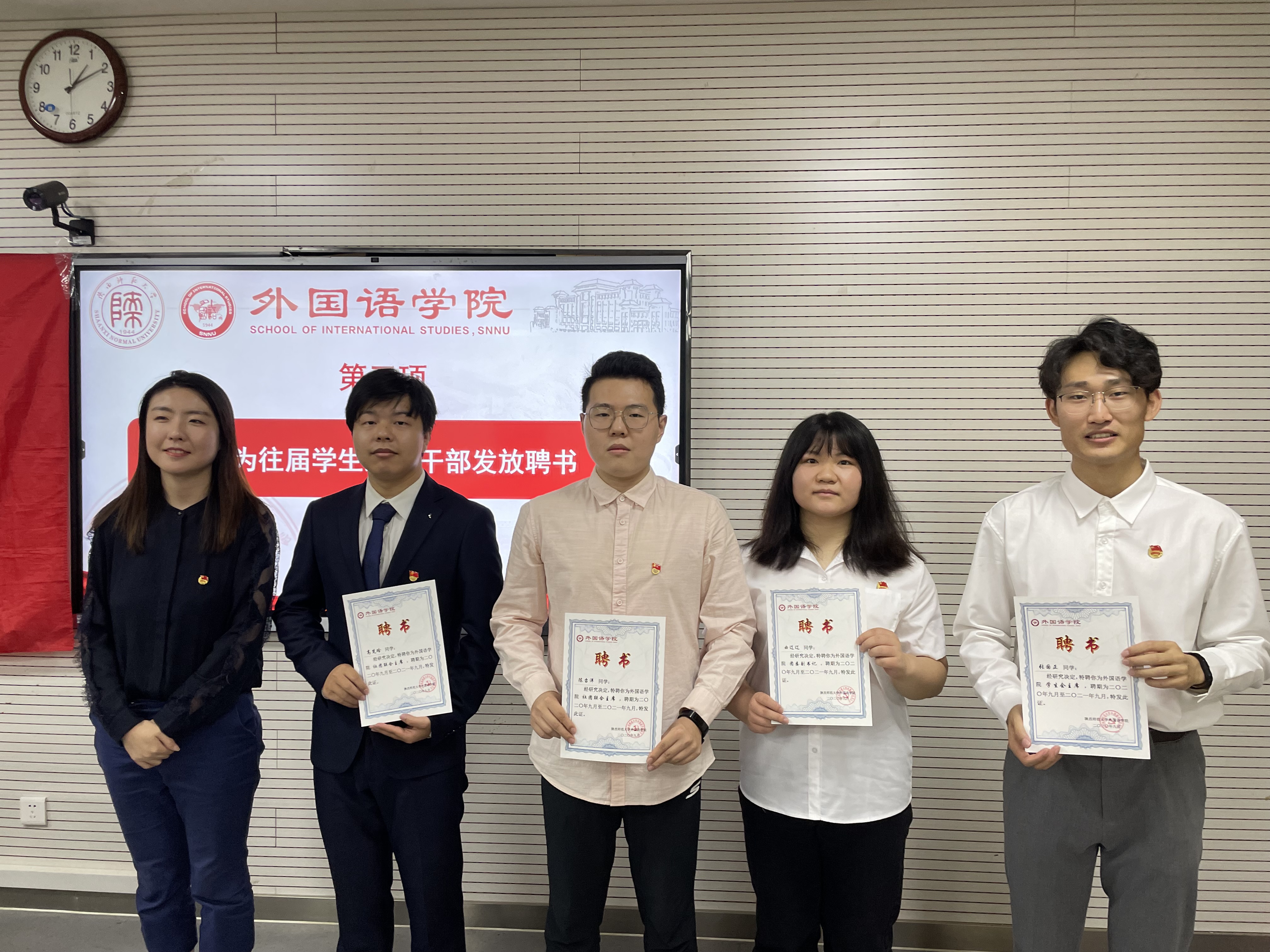 李丹为往届学生组织干部张国正、曲辽辽、陈召洋、高楚晗发放聘书,肯定他们在任期间的优秀工作,希望他们在毕业之后到更广阔的舞台施展才能、成就自我。