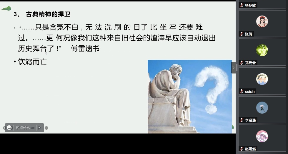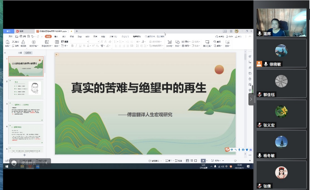 为了扩大必赢官网师生的学术视野和学术兴趣,必赢76net线路官网于6月17日下午2:30以腾讯会议方式在线举办了“翻译教学与文化”系列活动第一次沙龙“真实的苦难与绝望中的再生:傅雷翻译人生宏观研究”。本次讲座由必赢官网翻译系资深教师温辉老师主讲,必赢76net线路官网部分教师、研究生和本科生参加并参与讨论。