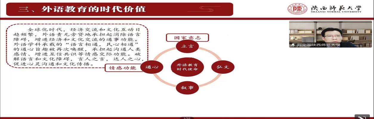 在同学们对外语教育的学科价值相关内涵有了基本的了解后,刘老师从更加宏观的角度讲解了外语教育的时代价值。“烟锁池塘柳,炮镇海城楼”,表现了汉语之美,汉语之妙,也告诉我们在学习外语的同时要坚守国家意志,把握外语教育的情动功能、肩负传达文化的使命、坚定正确的伦理方向。