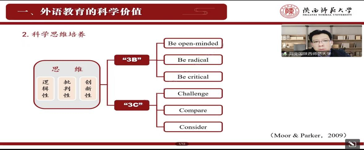 讲座中,刘老师从外语教学的科学价值、人文价值、时代价值三个维度来详细阐明外语教育的学科价值。首先,刘老师从先贤孔子的“修身、治国、平家、齐天下”来引入科学意识的唤醒,分析了现代工业文明的发生发展与当时社会的思想、文明分不开,从而间接论证了科学意识的重要性。接着,刘老师又引导大家去思考如何培养科学思维,并从逻辑思维、变通思维和批判性思维三个方面着重进行论述。他结合现实生活中的实例,使同学们对外语教育的学科价值有了更清晰的认知。