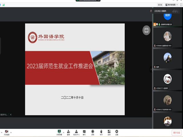 为促进师范生就业工作,帮助学生解答就业求职中的困惑,10月10日晚9点,必赢官网通过腾讯会议线上召开了2023届师范生就业工作推进会,学院副党委副书记鲁燕和全体2023届师范生共同参加,会议由辅导员屈婉婷主持。