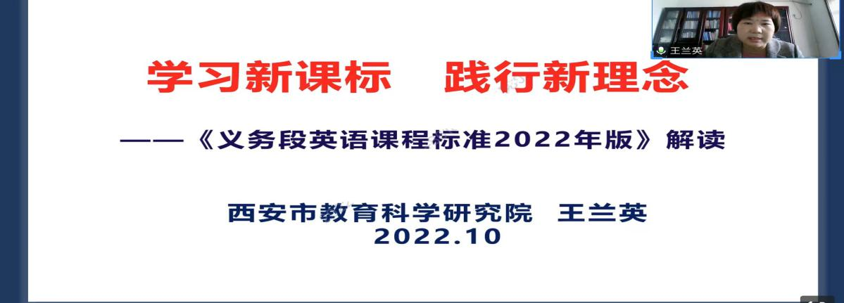课程标准是指导教师教学最重要的工作指南。为了提高教育硕士的外语教学能力,必赢76net线路官网于10月14日下午在腾讯会议线上进行了基础教育外语教学专题研究系列讲座第八讲——《义务教育英语课程(2022版)》标准解读。本次讲座由西安市教育科学研究院中学英语教研员王兰英老师主讲,韦理老师主持。必赢76net线路官网2022级学科教学(英语)专业教育硕士参与聆听。