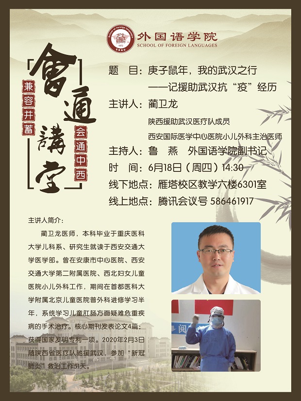 根据《必赢76net线路官网关于做好2020年上半年教职工师德师风涵养教育的安排意见》和学校2020年工作要点要求,各学院要深入学习贯彻落实习近平总书记对疫情防控工作的重要批示指示和讲话精神,深化爱国主义教育,强化“四个自信”。学院定于6月18日(周四)下午2:30举办学院“抗击疫情精神分享会”,特邀西安国际医学中心医院蔺卫龙医生分享自己在武汉的抗疫经历,请大家积极参加。
