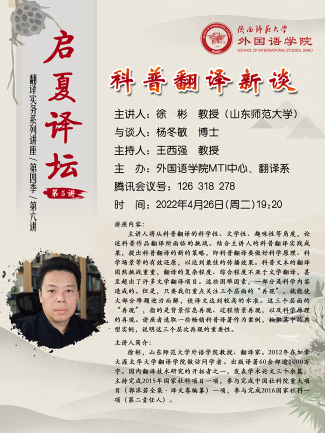 主讲人将从科普翻译的科学性、文学性、趣味性等角度,论述科普作品翻译所面临的挑战。结合主讲人的科普翻译实践成果,提出科普翻译的新的策略,即科普翻译要做好科学原理、科学场景等的有效还原,以达到最佳的传播效果。科普文本的翻译固然挑战重重,翻译的复杂程度、综合程度不亚于文学翻译,甚至超出了许多文学翻译项目。这些困难因素,一部分是科学内容造成的。但是,只要我们重点关注三个层面的“再现”,就能使大部分难题迎刃而解,使译文达到较高的水准。这三个层面的“再现”,指的是背景信息再现、过程情景再现,以及科学原理的再现。讲座者选取一些畅销科普译著作为案例,抽取其中的典型实例,说明这三个层次再现的重要性。